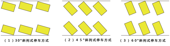 斜放式:斜放式停車車身方向與通道成角度停放,一般有30°、45°、60°三種角度,如下圖所示。