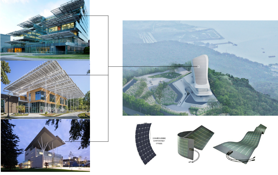 在綠色節能設計方面,建筑屋頂采用柔性太陽能光伏發電板滿鋪模式。綠色低碳,節能減排,是響應國家減碳降排、綠色節能的建筑設計要求。