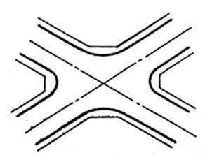 兩條道路垂直或近似垂直相交;其形式簡單,交通組織方便,街角建筑易于處理,適用范圍廣,是最基本的交叉口形式。