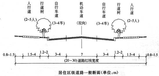1).居民區(qū)級道路:道路紅線之間的道路各項用地寬總和。