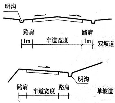 路面兩側(cè)不設(shè)高出的路緣石,而有保護(hù)路面的路肩,路肩外設(shè)明溝排除道路及兩側(cè)建筑用地的雨水;