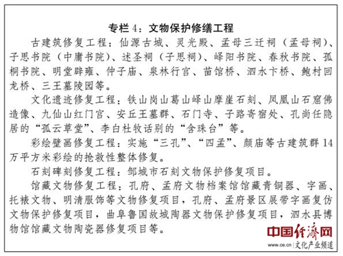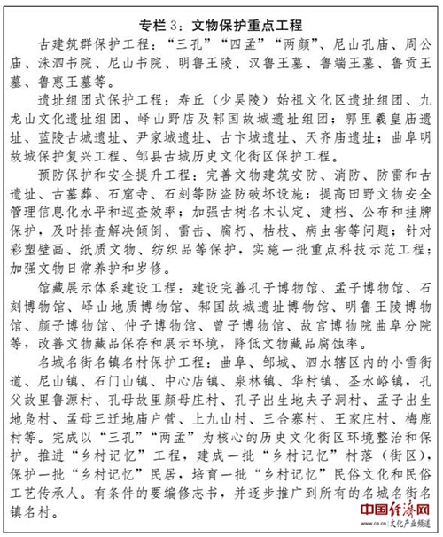 (三)建設(shè)國(guó)家記憶工程先行區(qū)。充分發(fā)揮擁有史前文化完整序列和脈絡(luò)清晰文化譜系的優(yōu)勢(shì),加強(qiáng)文化遺產(chǎn)及大遺址保護(hù),做好古建筑、古遺址的文物本體維修,實(shí)施搶救性保護(hù)、預(yù)防性保護(hù)和科學(xué)修復(fù)工程;加強(qiáng)文物資源系統(tǒng)梳理、典籍文獻(xiàn)搜集整理編纂保護(hù),建設(shè)儒家文化資源數(shù)據(jù)庫(kù);擴(kuò)大文物資源對(duì)公眾的開(kāi)放度,推動(dòng)博物館文創(chuàng)產(chǎn)品開(kāi)發(fā),建設(shè)全國(guó)文化遺產(chǎn)保護(hù)利用示范區(qū),在實(shí)施國(guó)家記憶工程進(jìn)程中走在前列。