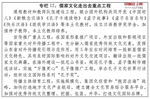 (三)創(chuàng)新儒家文化走出去模式。利用我國(guó)與世界各國(guó)文化合作交流機(jī)制框架,服務(wù)“一帶一路”戰(zhàn)略實(shí)施,發(fā)揮好文化年、旅游年、青少年交流年等平臺(tái)作用,注重培育市場(chǎng)化、民間化、專(zhuān)業(yè)化的傳播主體,促進(jìn)民心相通,向世界主動(dòng)傳播中國(guó)的價(jià)值理念與文化精髓。文化年,綜合運(yùn)用出境綜藝表演、文博展覽、民俗廟會(huì)、圖書(shū)展銷(xiāo)、廣播影視等多種形式和渠道,采取外國(guó)受眾易懂、易記、易學(xué)、易接受的方式和語(yǔ)言,形成全方位、多層次、寬領(lǐng)域、多渠道的交流新格局。旅游年,互相開(kāi)發(fā)更多個(gè)性化、定制化的深度游產(chǎn)品,支持中華醫(yī)藥、中華烹飪、中華武術(shù)、中華典籍、中國(guó)文物、中國(guó)園林、中國(guó)節(jié)日等中華傳統(tǒng)文化代表性項(xiàng)目走出去,在潤(rùn)物無(wú)聲中闡釋好中國(guó)特色。青少年交流年,促進(jìn)友好交流、務(wù)實(shí)合作,為外國(guó)青少年了解感知儒家文化搭建更多平臺(tái)、開(kāi)辟更廣渠道,織密心靈和情感的紐帶,為國(guó)家關(guān)系的未來(lái)發(fā)展打下牢固基礎(chǔ)。鞏固山東與友好省州、城市合作關(guān)系,不斷擴(kuò)大交流領(lǐng)域,重視民間力量、發(fā)掘民間智慧,在儒家文化交流方面取得更加豐碩的成果。加快鄒魯文化城市聯(lián)盟建設(shè),吸納更多海內(nèi)外城市加入聯(lián)盟,開(kāi)展鄒魯禮樂(lè)世界巡回展演,不斷提高鄒魯文化城市聯(lián)盟輻射力、影響力,推動(dòng)鄒魯文化城市品牌走向世界。
