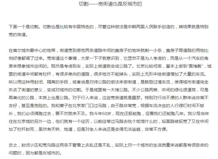 標題上看,談的城市設計,其實更多是針對城市問題,之所以起個標題叫城市設計,其實是旨在能進入城市設計領域有所建樹,這個無可厚非,這樣標題必定能引來建筑從業人員的共鳴,來實現從業領域的拓展。然,文我也略微仔細的讀了一下,談了蠻多觀點。要么都是老生常談