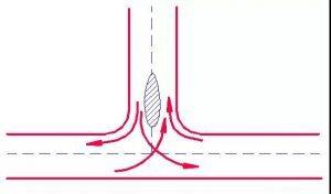 若無左轉彎車輛,四路交叉的沖突點由原來的16個減至4個。