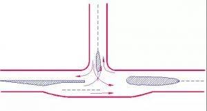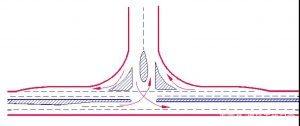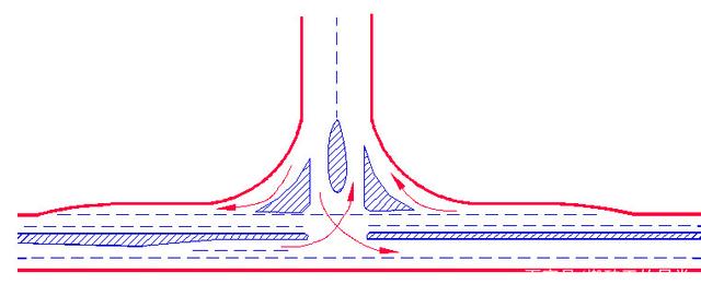 主要公路與次要公路的T形交叉,當轉彎交通量較大而會導致直行車輛的過分減速時,應采用加寬式T形交叉左轉彎交通量較大者,可采用該型式。