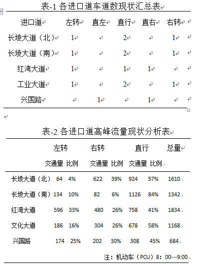 該交叉口各進(jìn)口道車(chē)道設(shè)置和流量現(xiàn)狀表-1和表-2所示。由表-2可知,長(zhǎng)堎大道和紅灣大道交通流量較大。實(shí)際調(diào)查中大中型車(chē)輛所占比例達(dá)到30%左右均集中在長(zhǎng)堎大道和紅灣大道。