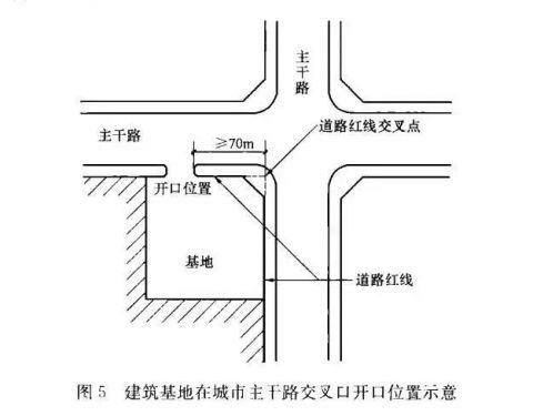 中等城市、大城市的主干路交叉口,自道路紅線交叉點(diǎn)起沿線70.0m范圍內(nèi)不應(yīng)設(shè)置機(jī)動車出入口。