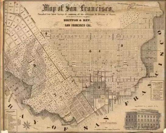 1811年曼哈頓專員的計劃試圖建立一個嚴格的街道網格,以發展島上的其他地區。幾十年后,這幅1852年的地圖顯示舊金山也做了同樣的事情,為了出于方便忽略了這個城市不規則的海岸線和地形。