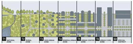 城市斷面圖被規劃人員作為劃分景觀層次的一種可視化多用途工具。這幅由建筑師安德雷斯·杜安伊創作的特別的作品,展示了自然和密集的城市區域之間的鄉村到城市的漸變,這已經成為新城市主義者的一個流行架構。