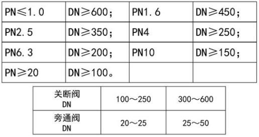 壓力≥1.6MPa,且直徑≥500mm的閘閥應安裝旁通閥。直徑按閥門直徑十分之一選用。