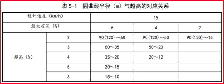《規(guī)范》表5-1 圓曲線半徑(m)與超高的對應關系