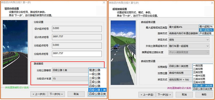 緯地軟件加寬設計功能4、集成了完整的公路設計規(guī)范指標緯地軟件支持用戶自定義各等級技術指標,用戶可根據(jù)需要,對技術標準庫進行編輯與擴充。針對《小交通量農(nóng)村公路工程技術標準》,緯地軟件已于該標準發(fā)布第一時間,進行了研習,并集成了相關技術指標,用戶可根據(jù)項目等級,直接選擇小交通量道路等級,并由軟件,自動完成路幅寬度、斷面形式提取,超高加寬等自動計算。