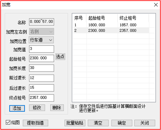 緯地軟件實現(xiàn)任意復雜線形設計3、批量設計錯車道和斷面寬度變化針對低等級公路需要添加的錯車道數(shù)量較多或者設置護欄時土路肩需要加寬的情況,緯地軟件增加了快速加寬設計功能。可根據(jù)加寬需求設置加寬名稱、加寬位置(含行車道、硬路肩、土路肩)、加寬值、加寬起終點樁號、加寬長度、過渡段長度等參數(shù),也可直接提取該項目的擋墻設置段落進行加寬設計。