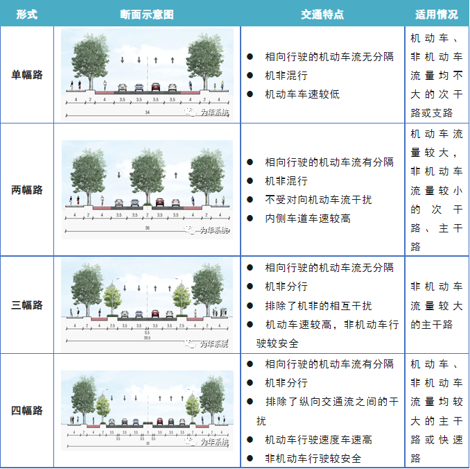 城市道路斷面組成要素通常包括:機動車道、非機動車道、人行道、中央分隔帶、機非分隔帶等類型。道路橫斷面一般可分為單幅路、兩幅路、三幅路、四幅路,各種斷面特點和適用情況如下。