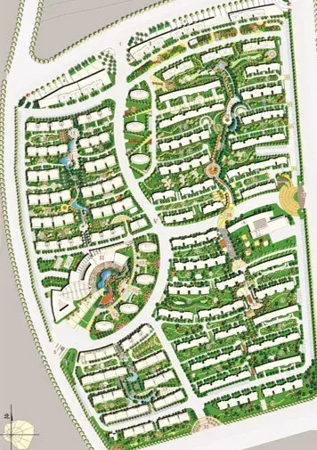 用地中間做環形道路,向外引出錯落的分支道路,形成各自獨立的組團,中心適宜做景觀。