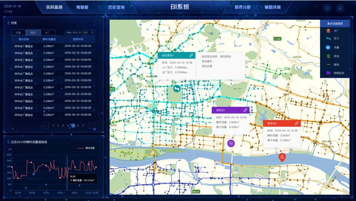 安裝物聯感知設備,對監測點數據如壓力、流量、水質等進行實時采集、在線監測。實現生成監測點歷史監測數據相關報表、趨勢曲線等。