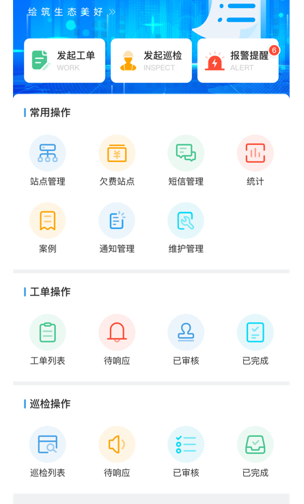 微信小程序主要為用戶提供各種線上服務,涵蓋工單模塊、巡檢模塊、報警模塊、站點管理等功能。