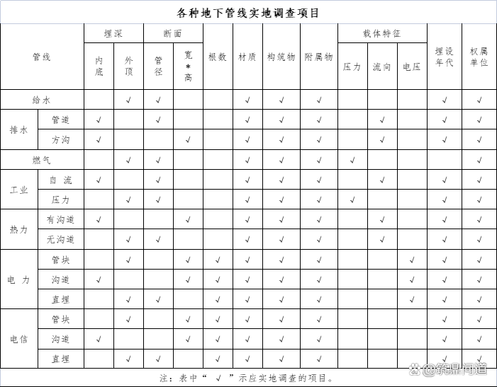 地下管線調(diào)查項目有地下管線的平面位置、埋深(或高程)、流向、壓力以及管線規(guī)格、性質(zhì)、材料、權(quán)屬等屬性。