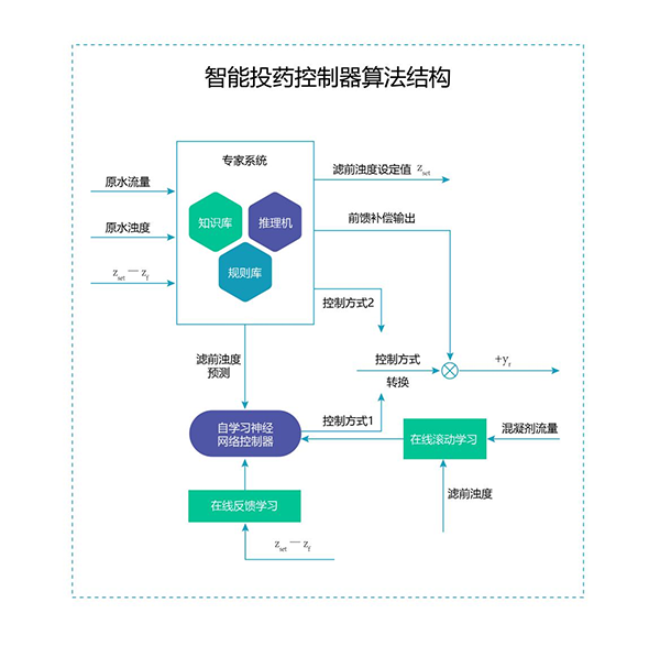 首先通過前饋專家模型采集分析源水流量、濁度、 PH 值 等數據信息并快速建模,再利用人工神經網絡對模型進行深度學習,通過多步預測、滾動優化和反饋校正識別出加藥量和變量之間的對應關系,最終得出最精準的藥劑投加量?;苍浦悄芗铀幭到y可通過軟件平臺對工藝過程進行全自動監控、診斷,投藥全程自動化控制,設備故障自動進行切換控制;實現對設備運行、藥劑消耗、水質監控等方面進行實時診斷、數據分析、故障預測及報警 。